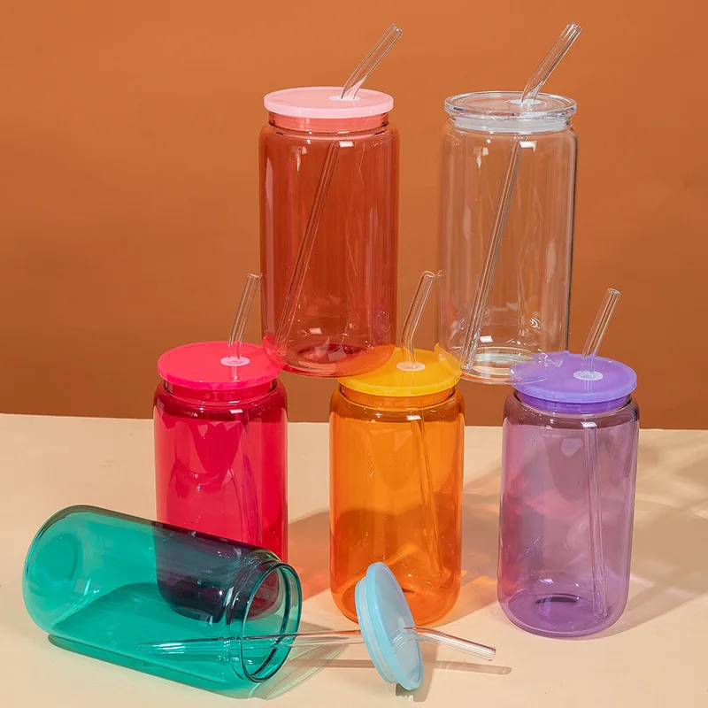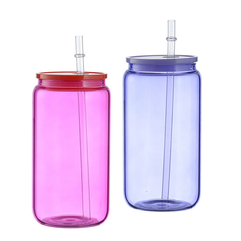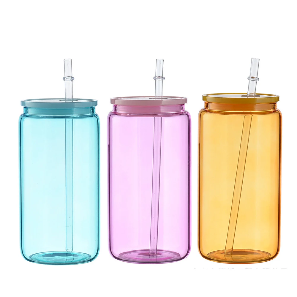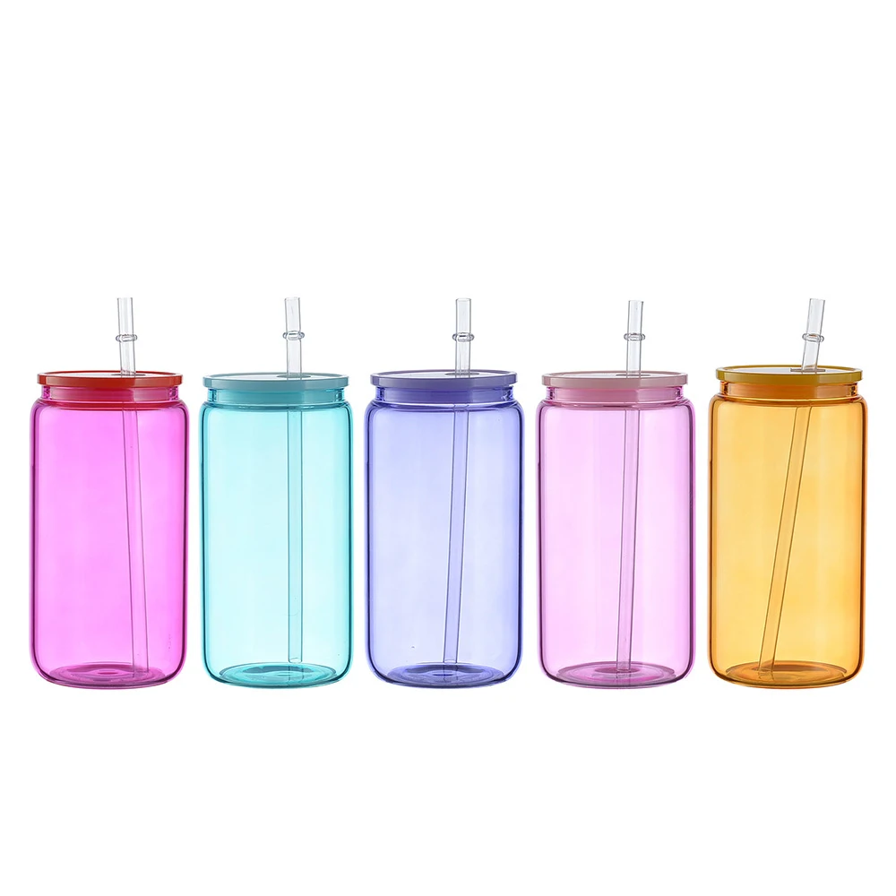 500 Ml 16Oz Wholesale Kids Clear Colorful Transparent Reusable Glass Water Drink Bottles With Straw Lid