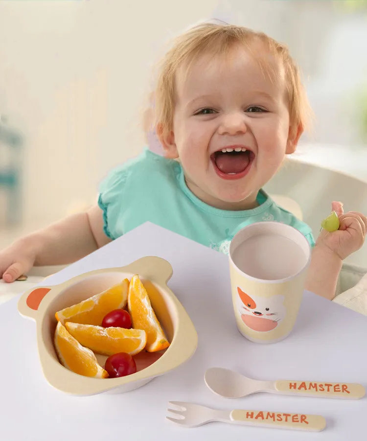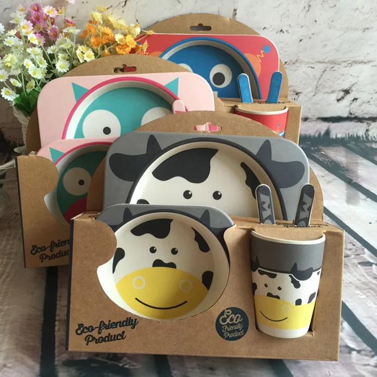 Custom Cartoon 5 Pcs Square Baby Tableware Plate Sets Dinnerware Bamboo Fiber Kids Dinner Set